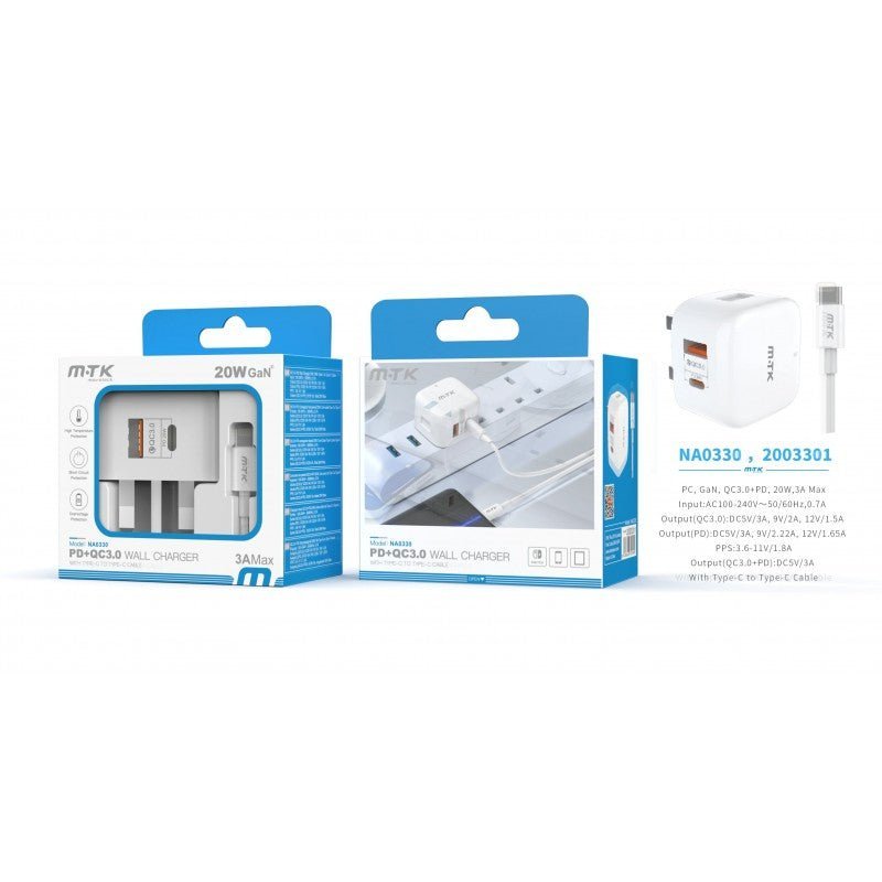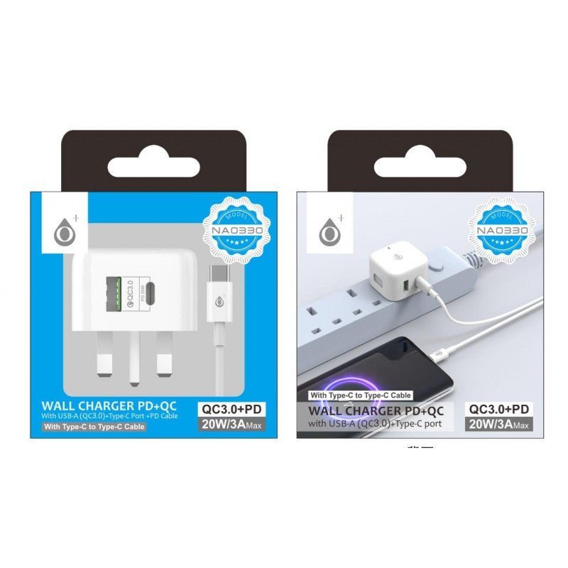 NA0330 TypeC 20W PD & USB 3A QC Wall Charger with TypeC to TypeC Fast Cable, White